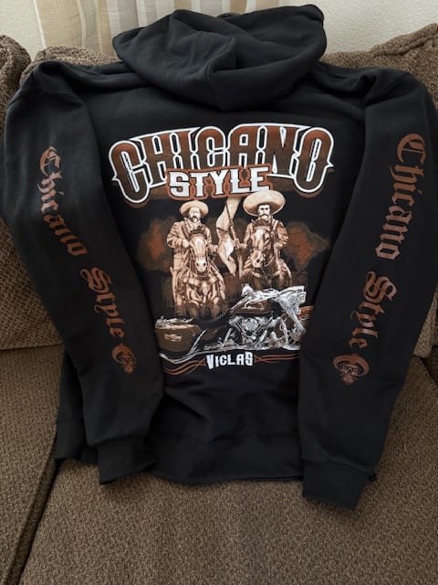 Our Chicano Style caballeros design in a hooded sweatshirt. sweatshirt is a jersey's brand that is one of our top sellers. limited supply and not normally sold on line.