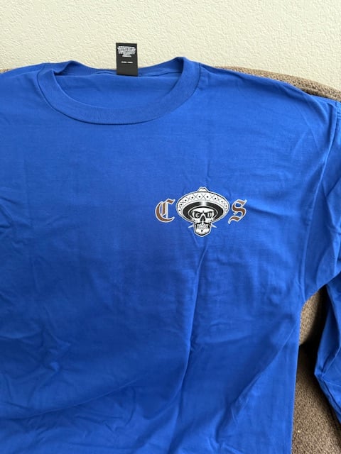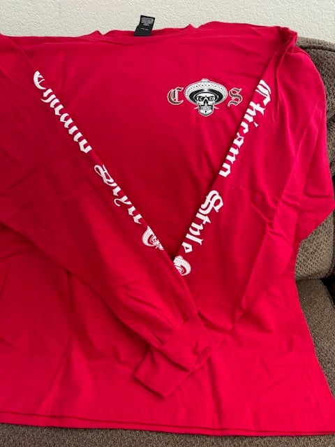 Long Sleeve aztec skull design with writing on arm and logo in front with CS design in back. The shirt is Gilden Hammer or Hanes Beffy T which is a heavier pre shrunk cotton shirt that is our best sellers. These are limited release. Majority of the time these are only available at events.